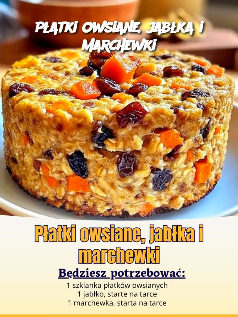 Składniki: 1 szklanka płatków owsianych 2 szklanki wody lub mleka 1 jabłko, starte na tarce 1 marchewka, starta na tarce 2 łyżki miodu lub syropu klonowego 1/2 łyżeczki cynamonu Sól do smaku Orzechy lub rodzynki do dekoracji (opcjonalnie) Instrukcje: Przepis jest kontynuowany na następnej stronie