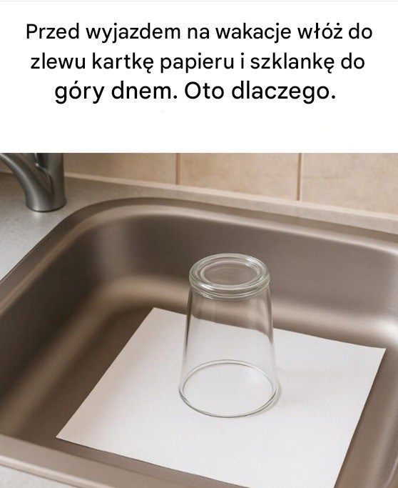 Myślimy o wszystkim przed wyjściem: zakręcamy wodę, opróżniamy lodówkę, nastawiamy budzik. Ale co ze zlewem? Często o nim zapominamy. A jednak to właśnie tam często pojawiają się nieprzyjemne niespodzianki. Nieprzyjemne zapachy, wilgoć, owady… Na szczęście istnieje bardzo prosty trik, sprawdzony przez profesjonalistów, darmowy i bardzo skuteczny: połóż szklankę do góry dnem na kartce papieru w zlewie. Mały gest, który może zdziałać cuda.